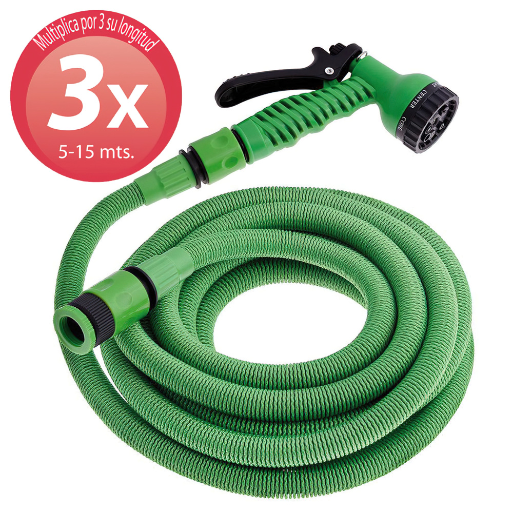 - Manguera Extensible Riego Compacto 5 A 15 Metros Con Pistola 7 Posiciones
