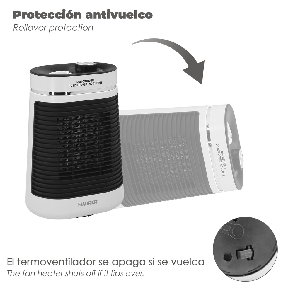 - El calefactor cuenta con un dispositivo antivuelco y con protección contra sobrecalentamiento, que apaga el aparato automáticamente en caso de caída o sobrecalentamiento.